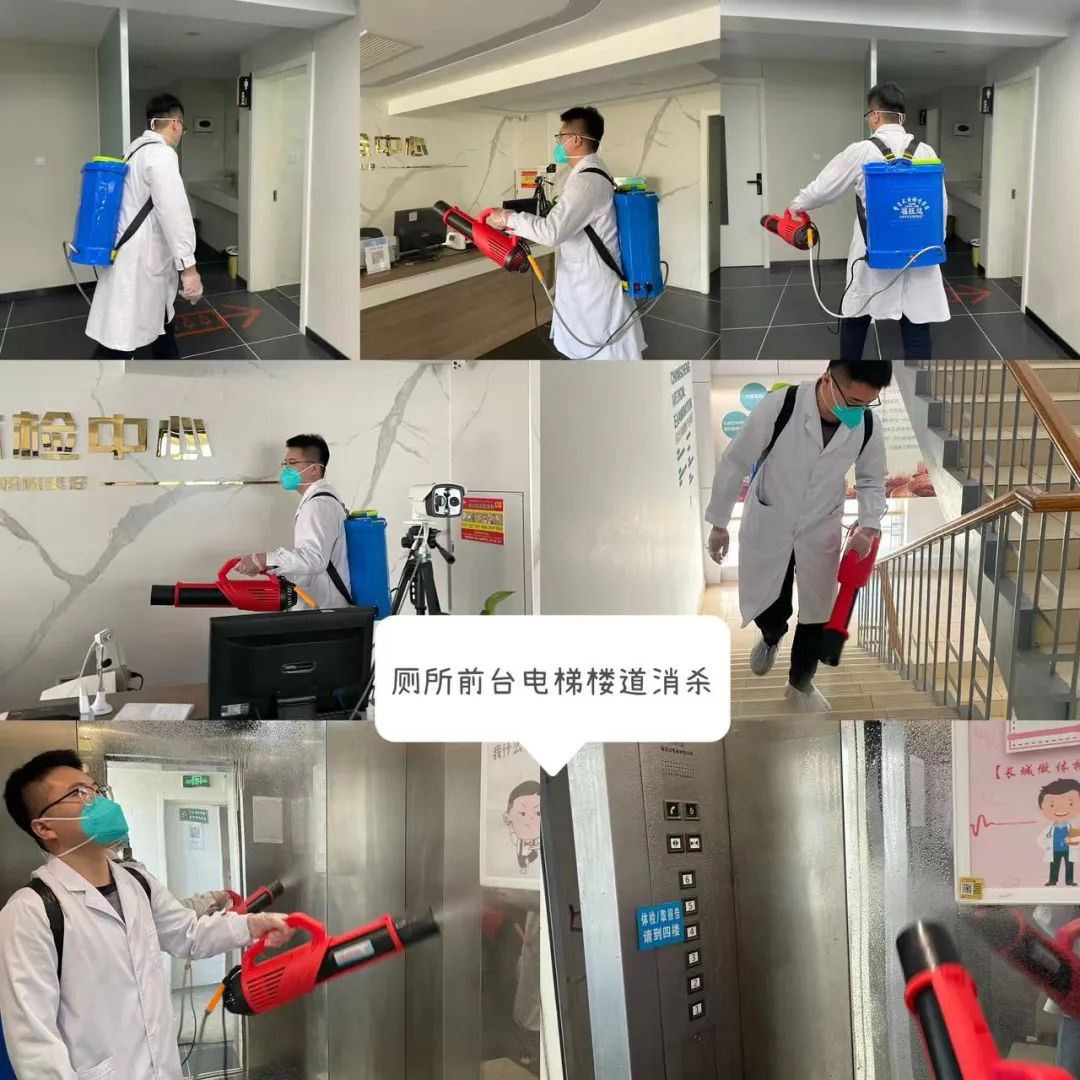 上午的体检服务结束后,除了对防疫物品的清点、更换外,还进行体检中心大清扫和消毒。接待大厅、餐厅、桌椅、电脑、各检查科室、卫生间、电梯、检查仪器、签字笔等均进行整理和消毒。